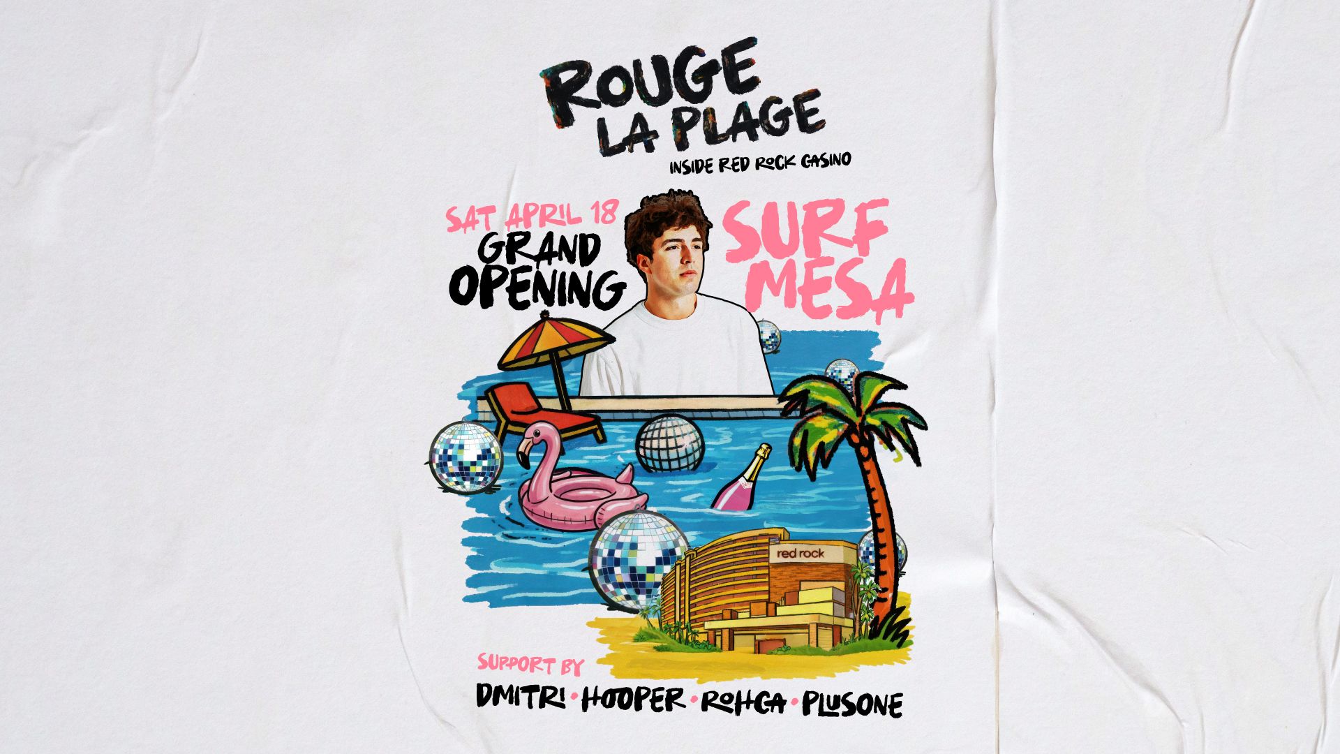 Surf Mesa brings his signature sun-soaked sound to the Grand Opening of Rouge La Plage—the all-new day club experience from Rouge Room at Red Rock Casino. Known for blending melodic house, chill electronic textures, and feel-good dance energy, Surf Mesa creates the kind of atmosphere that feels effortless yet unforgettable.